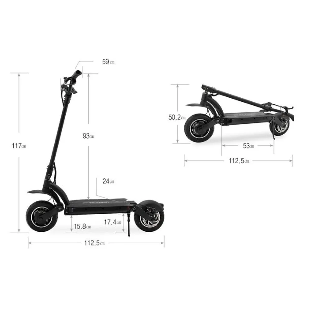 Характеристики модели достаточно впечатляют. Они удовлетворят потребности самых капризных пользователей. Мощность двигателя 800 Вт, при этом максимальная скорость электросамоката 50 км/ч, электронная и дисковая тормозная система позволяют чувствовать уверенность в городской суете. Весовая нагрузка на самокат достигает 120 кг. При этом, амортизация позволяет комфортно преодолевать неровности дорожного покрытия. Рама из алюминия, достаточно прочная и легкая. Диаметр колес 10 дюймов отлично подходит для элекросамоката такой мощности.