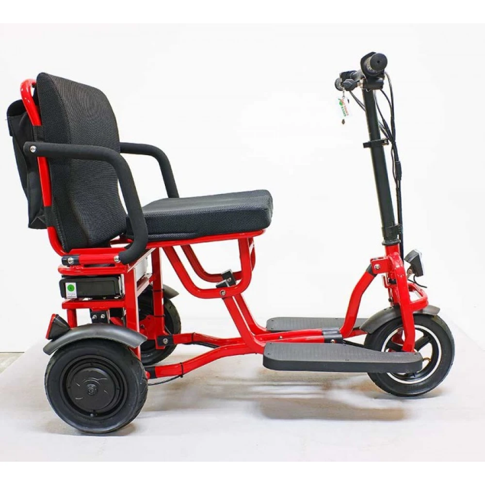 Широкая прорезиненная платформа обеспечивает полноценное размещение стоп, не вызывает усталости ездока. Светодиодная передняя фара допускает движение в вечернее время суток и непогоду. Электротрицикл – современная складная техника, которую сложить можно движением одной руки. В сложенном положении техника напоминает чемодан с ручкой.