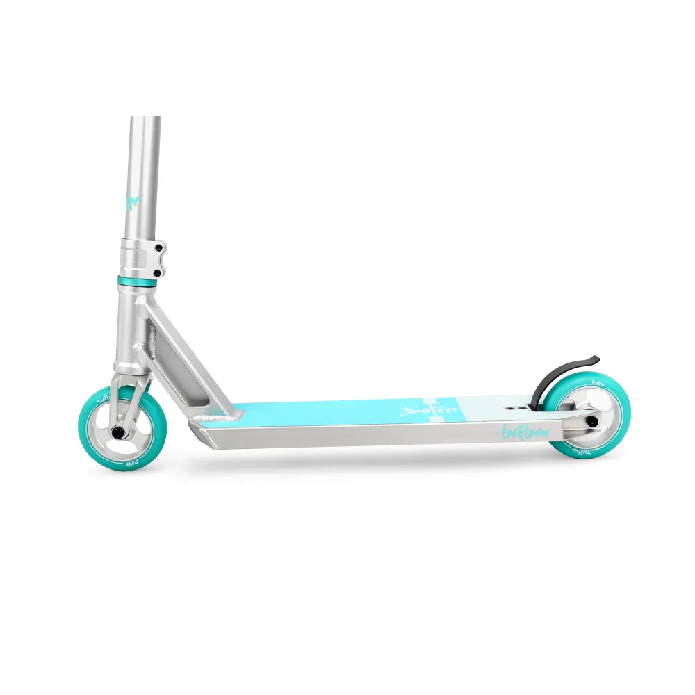 Этот трюковый самокат создан для профессиональной езды в парке. Скоростные колёса диаметром 110 мм, выполнены из алюминия, придают самокату максимальную скорость. Манёвренность и хороший отскок самоката обеспечивает покрытие колёс из полиуретана 88А, имеющих ширину 26 мм. У самоката имеются высококачественные подшипниками АВЕС 9, придающие самокату хороший накат.