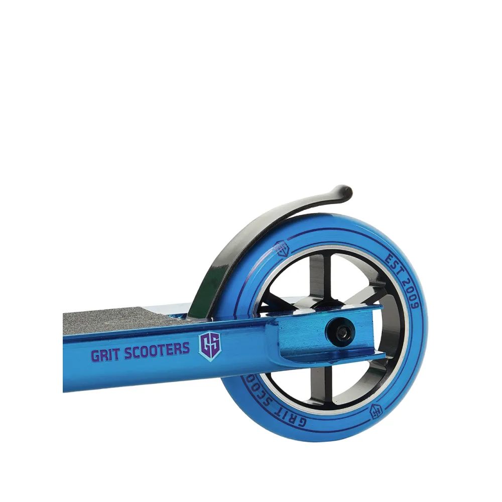 Трюковой самокат Grit Glam 110 мм, фиолетово-синего цвета – лидер продаж с современной амортизацией Rigid понравится требовательным пользователям. Амортизаторы прекрасно смягчают наезд на дорожные кочки и ямы, позволяет не чувствовать дискомфорта и усталости при длительных поездках.